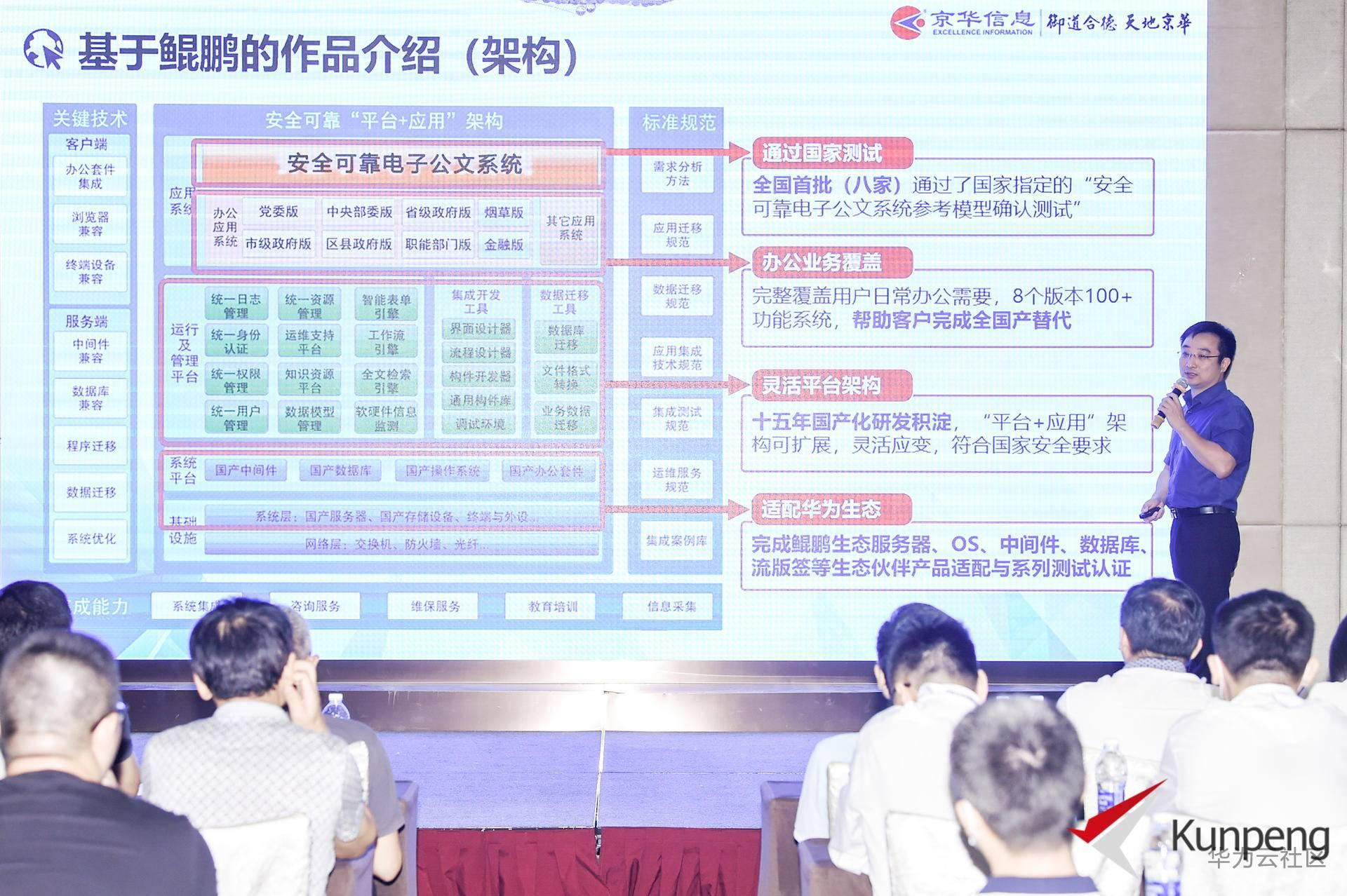 京华智慧工作台的项目宣讲人介绍到:工作平台目前 100 多个系统中,超 60 个系统专注于政务办公,涵盖了公文、会议、行政、后勤、信息、知识六大主要业务,构建“以事为核心,一事多件”的公文管理模型,在办“事”的过程中可以随时发起各文种审批,并自动建立相关办文过程的自动关联,前可查事件来源,后可查办理情况。智慧平台还将业务中产生的过程数据和结果数据进行大数据分析,辅助办文人员工作,推送同类文件、模拟生成批示意见,为党政机关流程优化、提高效能提供科学的决策支持。尤其值得一提的是,作为广州市政务管理平台的实践者与先行者,京华信息全线产品已完成了华为鲲鹏生态的全部适配,获得了包括华为开源 OA,数据库等产品的认证,智慧工作平台基于鲲鹏架构调优,获得了优异的性能测试结果。