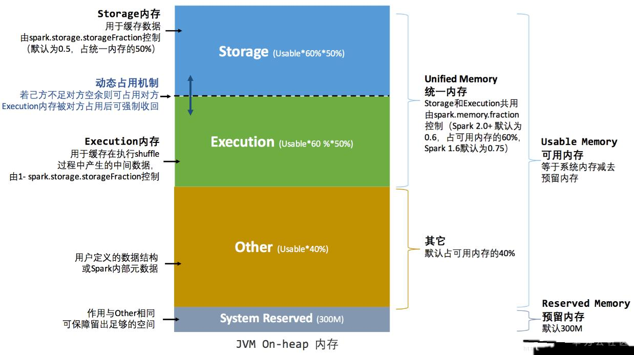 3.1 Spark的堆内内存是在程序启动是根据-executor-memory或者spark.executor.memory配置的,可以按照上面对应图中的比例参数进行内存的计算;Spark堆外内存也是在程序启动是根据spark.memory.offHeap.size配置的,同样也可以按照对应图示中的比例进行内存的计算