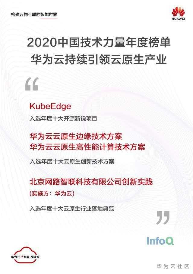 今日,由InfoQ 发起并组织的【2020 中国技术力量年度榜单评选】结果正式揭晓,华为云表现抢眼,一连拿下四个席位:KubeEdge入选年度十大开源新锐项目,华为云云原生边缘技术方案、华为云云原生高性能计算技术方案入选年度十大云原生创新技术方案,北京网路智联科技有限公司基于华为云原生的创新实践则被评为年度十大云原生行业落地典范。