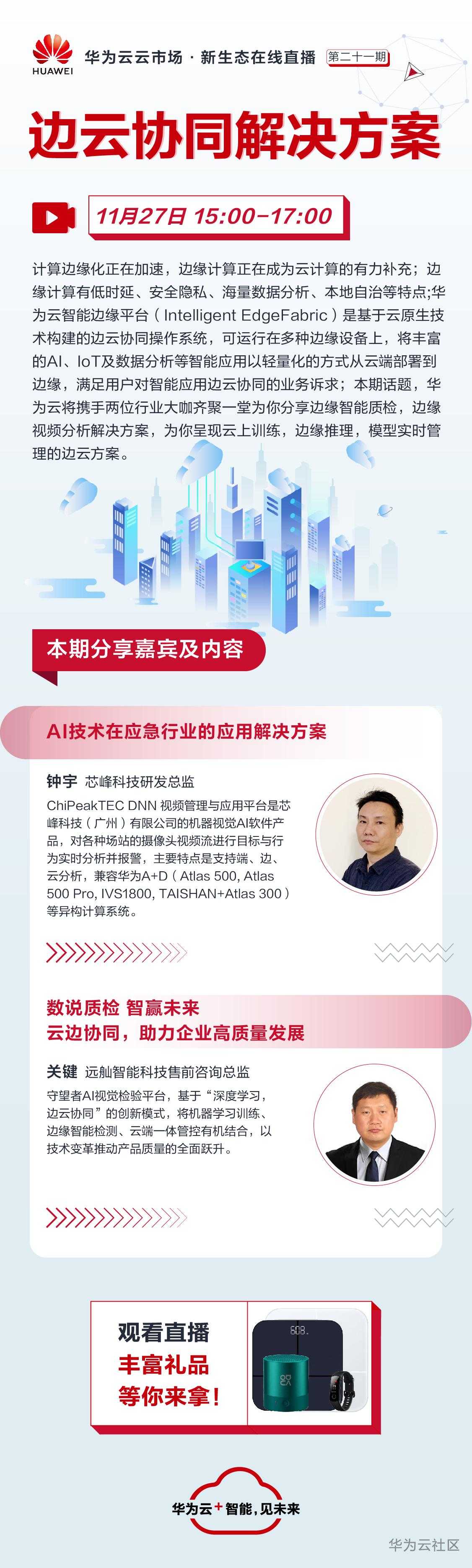 本期话题,华为云将携手两位行业大咖齐聚一堂为你分享边缘智能质检,边缘视频分析解决方案,为你呈现云上训练,边缘推理,模型实时管理的边云方案。