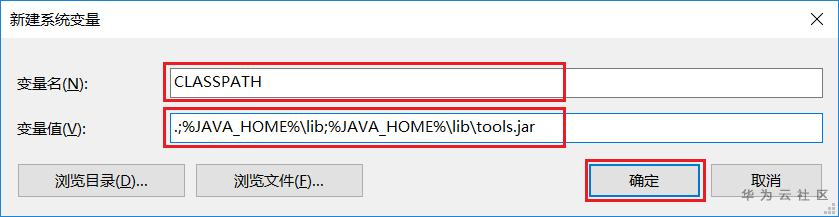 9)新建变量名为:“CLASSPATH”,变量值为“.;%JAVA_HOME%\lib;%JAVA_HOME%\lib\tools.jar”。单击“确定”按钮完成“CLASSPATH”的配置。