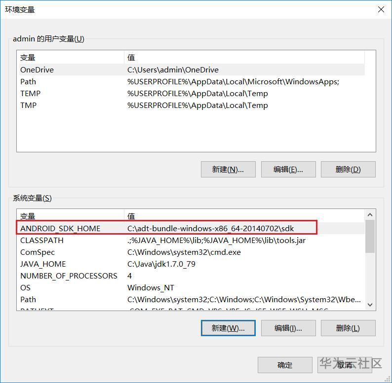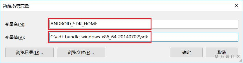 2、同上,新建系统变量,变量名:“ANDROID_SDK_HOME”,变量值:“C:\adt-bundle-windows-x86_64-20140702\sdk”。