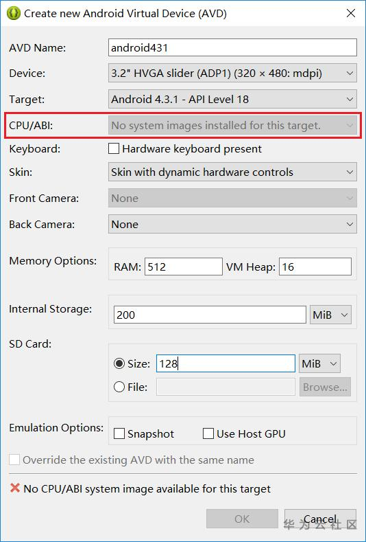 10、按图中所示进行设置。但“CPU/ABI”中显示为“No system images installed for this target”。