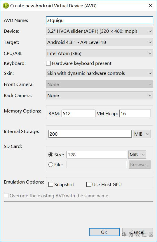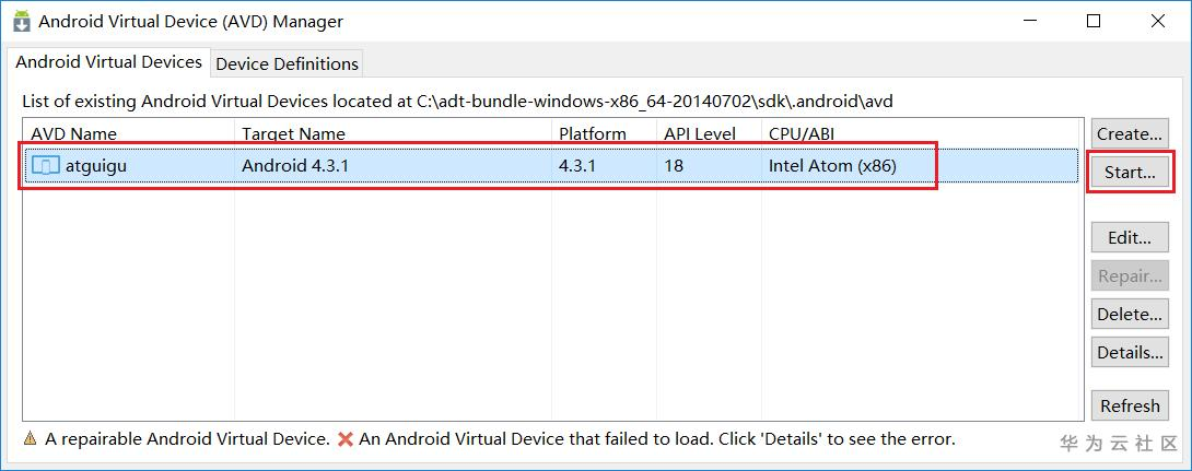 16、Android Virtual Device Manager中显示刚刚创建的“atguigu”AVD。单击右侧的“Start”启动AVD。