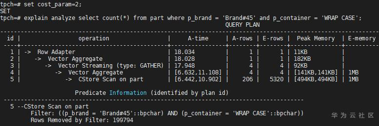 从估算出的行数(E-rows)和实际的行数(A-rows)对比可以看出,cost_param=0的不相关模型适合part表的p_brand和p_container列。