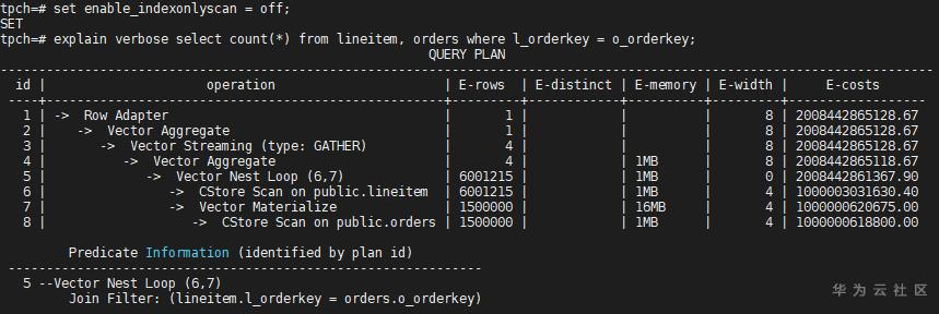 lineitem的扫描变成了Index Only Scan(因为l_orderkey的类型是int),而在orders表上仍然选择Seq Scan(因为没有其他路径),同时关联方式也变为了Nest Loop,因为Hash Join需要全表扫描数据(lineitem的Seq Scan已经被关掉了)。优化器的选择方式我们从代价(E-costs)一栏中也可以看出。再把Index Only Scan关掉,看看计划如何变化: