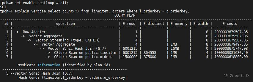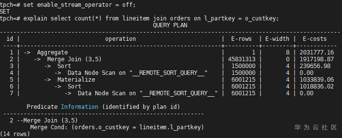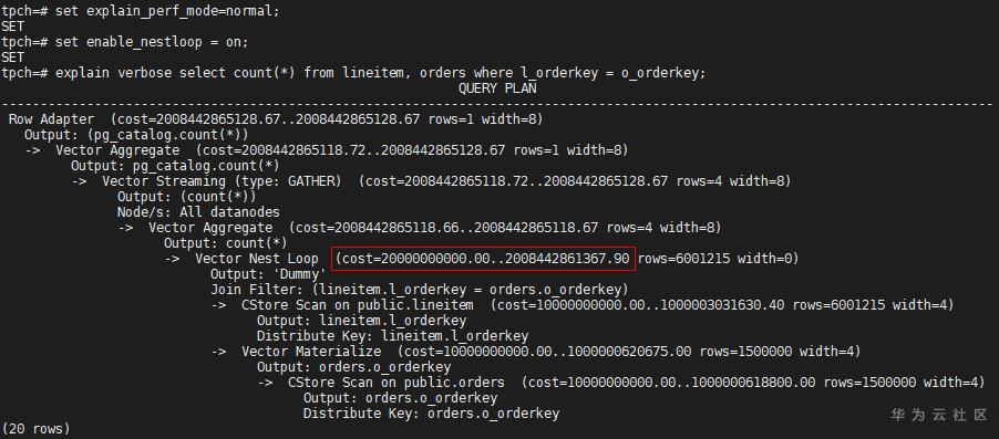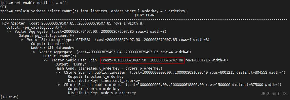 如果再把Merge Join路径关掉,可能就会选择Nest Loop路径。关联方式的控制开关一般用于调优或规避问题,但具体是否能够起作用要看具体的语句,除了当前关联方式,还有没有其他方式。实际场景中,一个语句中关联的算子较多,一般很难用参数enable_hashjoin或enable_nestloop或enable_mergejoin来控制某两个表的Join方式,GaussDB中更细致的语句级别的调优手段是Plan Hint,感兴趣的读者可以参考产品手册。