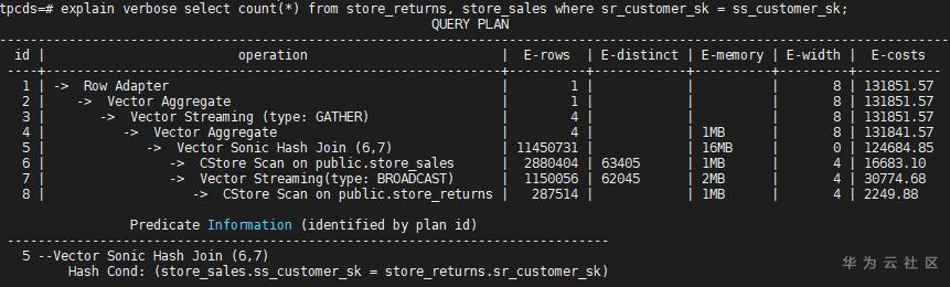 由于两个表的分布键都不是Join Key,因此走Hash Join路径的话需要有一个表做Broadcast或者两个表都做Redistribute,但是store_sales表比较大(E-rows显示28.7亿行),而sr_tbl表行数估算比较少(E-rows显示100行),优化器认为适合做Broadcast。于是最终选择了一边Broadcast的计划。