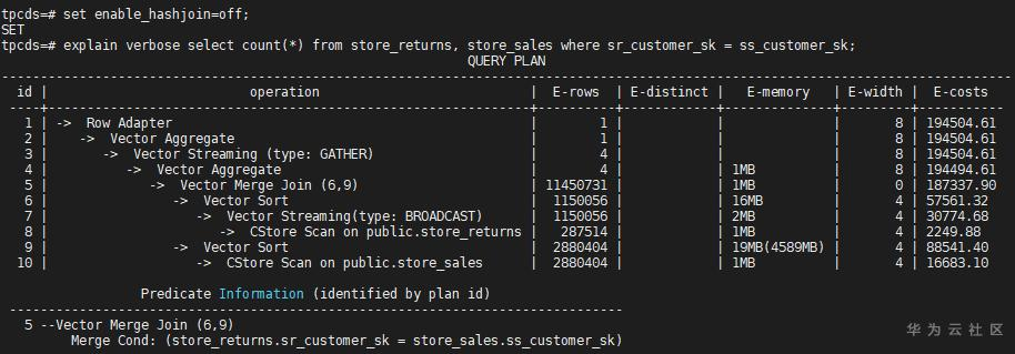 GaussDB优化器中表关联的主要方式有:Nest Loop,Hash Join和Merge Join,分别可以通过enable_nestloop、enable_hashjoin、enable_mergejoin进行控制,这种控制也不是绝对的,可以理解为是否优先选择。大部分场景下,三种路径的代价关系:Hash Join < Merge Join < Nest Loop。我们以一个简单的关联示例说明,store_returns和store_sales是TPC-DS 1x中两个表,SQL如下: