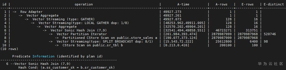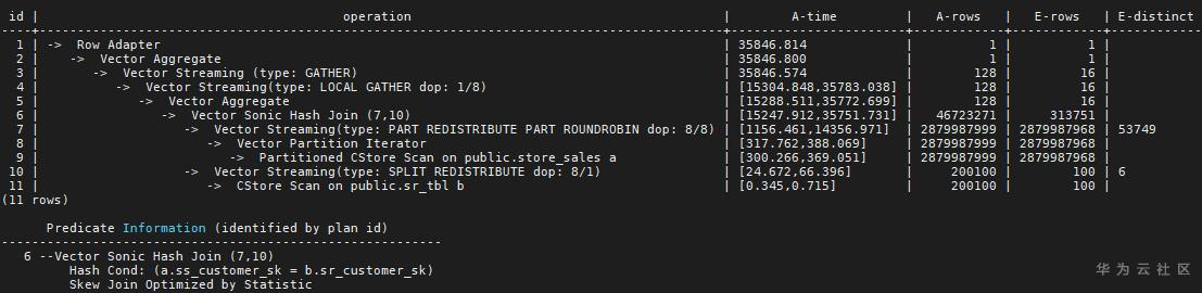 我们考虑两个表的简单关联,store_sales和sr_tbl,它们的分布键分别是ss_item_sk 和sr_returned_date_sk,Join 条件是store_sales.ss_customer_sk =sr_tbl. sr_customer_sk,执行结果如下:
