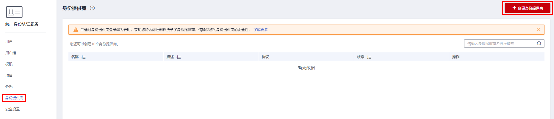 进入IAM控制台,在左侧导航窗格中,单击“身份提供商”。