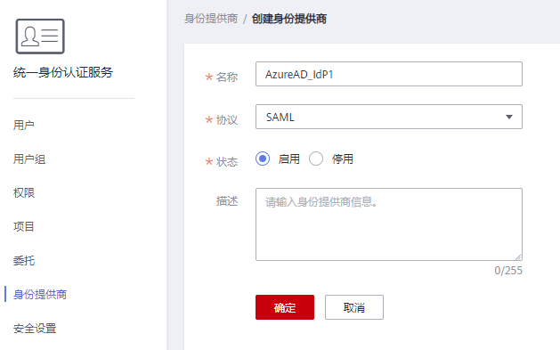 在”创建身份提供商“窗口中填写参数。例如将身份提供商命名为“AzureAD_IdP”。