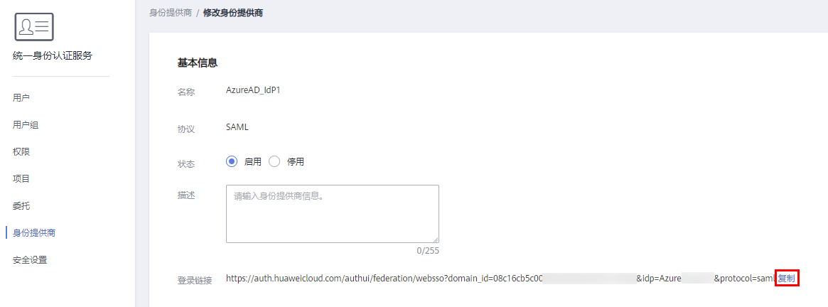 配置身份提供商信息。单击身份提供商中“操作”列的“修改”。