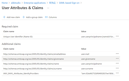 参考上文“在Azure AD中配置华为云系统信息”步骤9,进入到Azure AD的用户属性及声明详细配置页面。