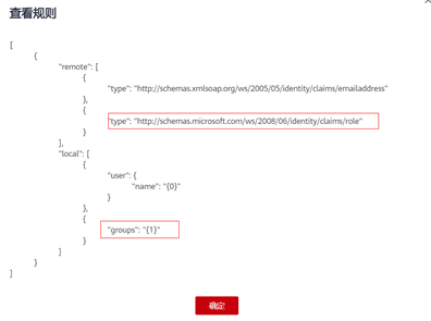 单击“编辑规则”,将以下规则拷贝至规则框内,表示将Azure AD的name映射到华为云本地name,归属于admin的用户组,拥有admin组的权限。