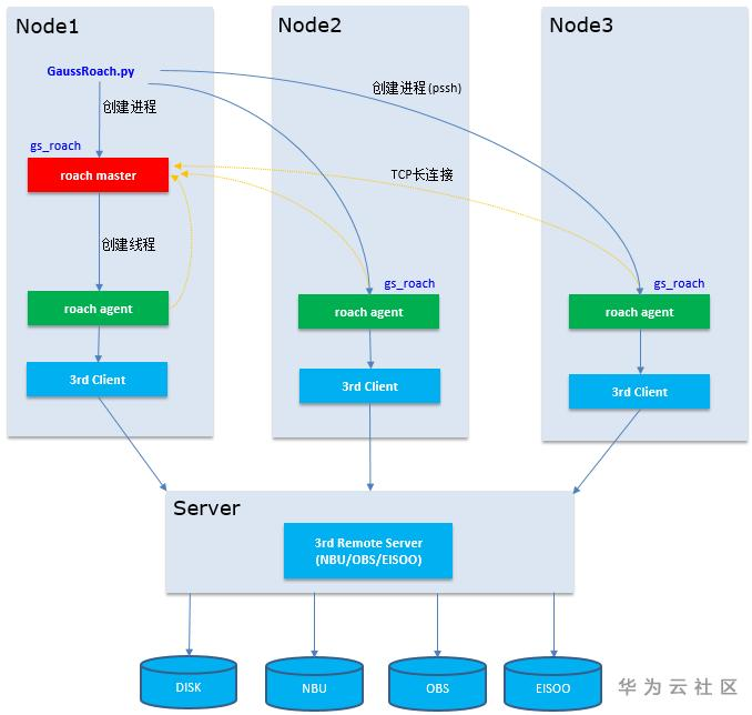 备份/恢复的原理图如下,在各个结点将实例备份到相应的介质上,并从介质上恢复到新集群或老集群中。详细的功能不在此处展开描述,大家可以参考(详情参见Roach备份恢复GaussDB(DWS)) 来了解细节。