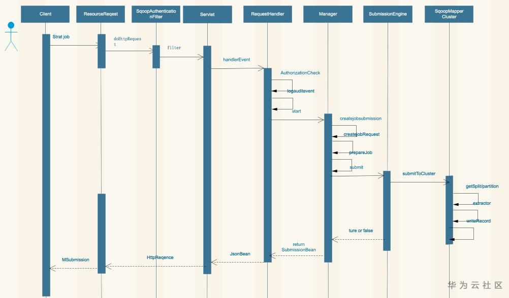 一个sqoop作业从客户端向服务端提交请求、发送请求、鉴权、授权、生成作业、提交作业、etl流程、返回结果的流程如下图所示:
