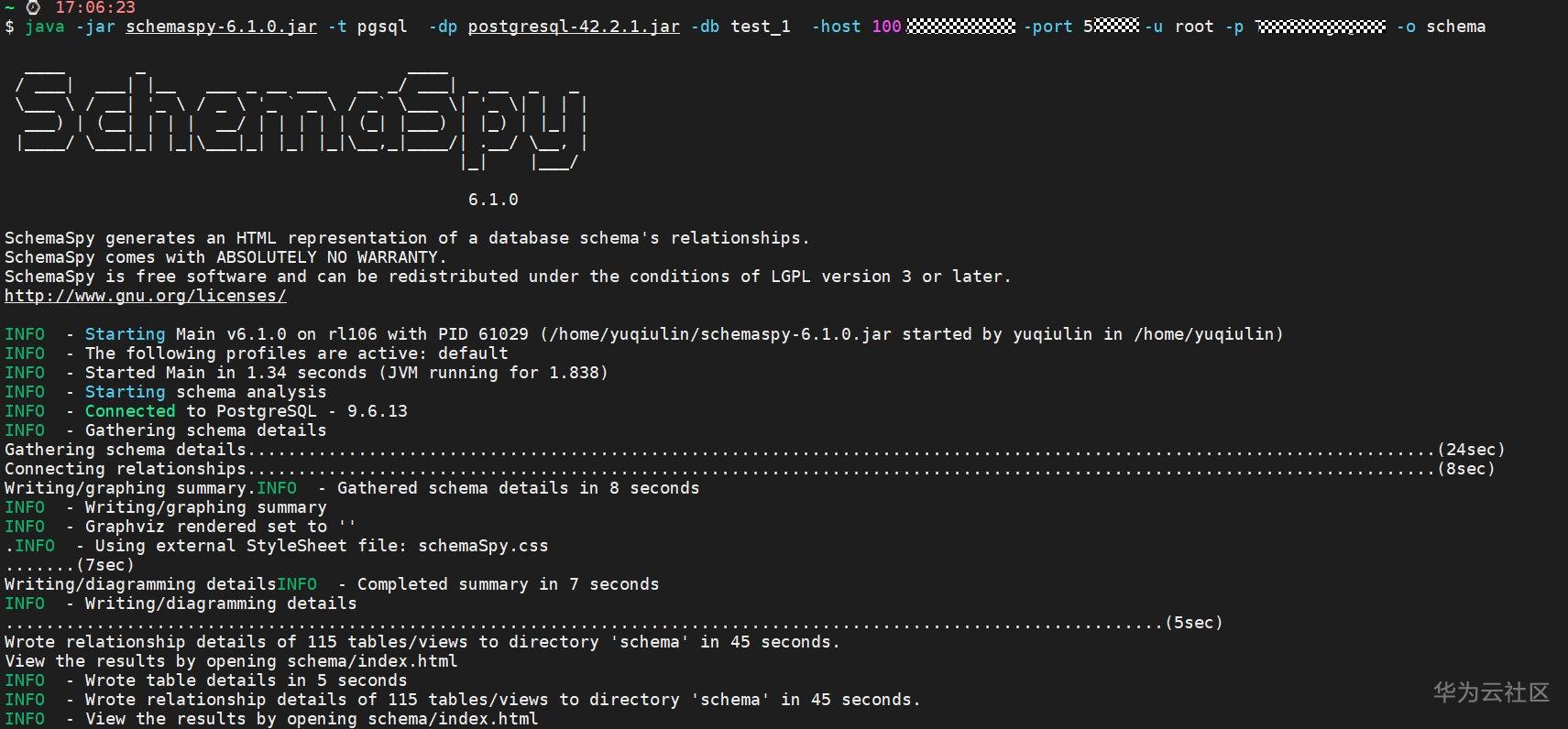java -jar schemaspy-6.1.0.jar -t pgsql -dp postgresql-42.2.1.jar -db test_1 -host 100.xxx.xxx.195 -port 54xx -u root -p YOURPASSWD -o schema