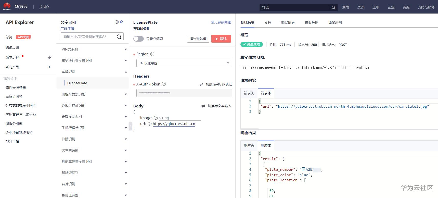 我试用的是 EI 企业智能板块的 OCR 光学文字识别服务。从申请账号开始,到第一个车牌识别调用成功总共耗时20分钟,我一边做一边看产品文档,没有一味追求速度。