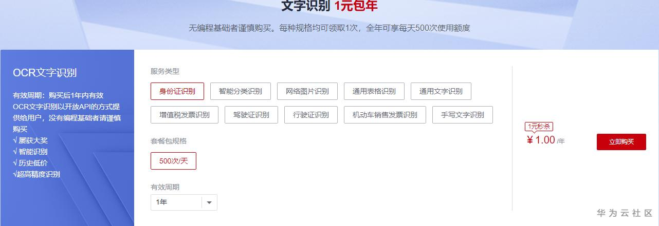 因为官网促销,单个OCR 服务包年只要1元钱, OBS 服务开通1元钱, 单日存储9分钱, 我总共花了2.09人民币体验了完整的OCR,而且今天我还有499个车牌可以识别。