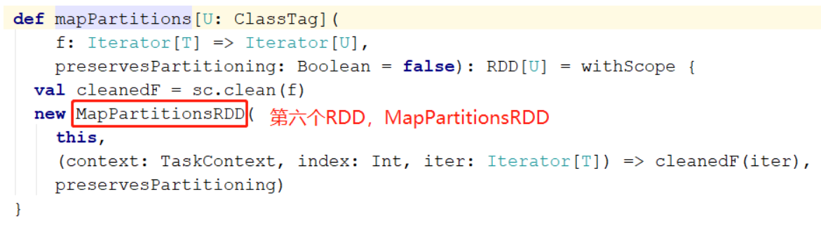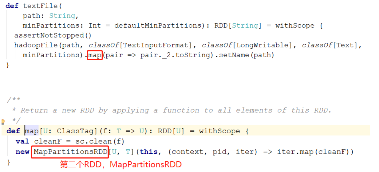 hadoopFile 方法返回的是个 RDD(HadoopRDD),在对这个RDD调用map方法,点到 map 方法中可以看到 ,map 方法中产生了一个 MapPartitionsRDD