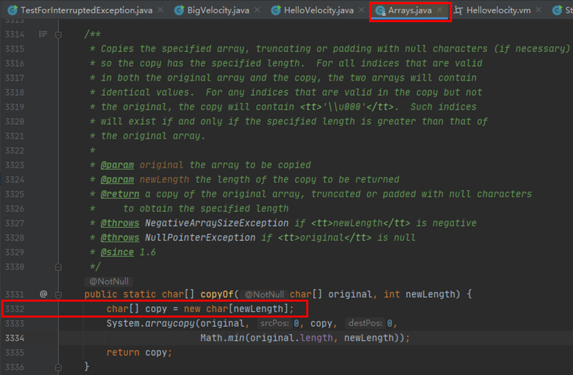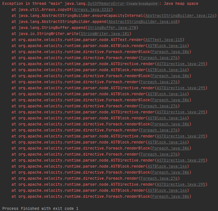 Velocity模板生成的结果写入StringWriter对象中,如前面分析,其底层是一个char数组。直接产生OOM的代码在于java.util.Array.copyOf()函数: