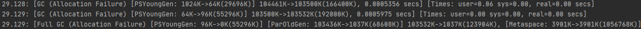 限制jvm初始内存为100M,最大堆内存为200M。并在jvm发生垃圾回收时及时打印详细的GC信息以及时间戳。而我的代码里要做的事情就是重现jvm内存不够而不得不发生垃圾回收。同时观察操作系统层面该java进程的内存占用。