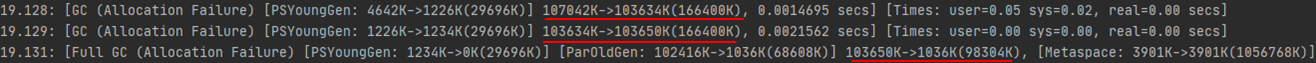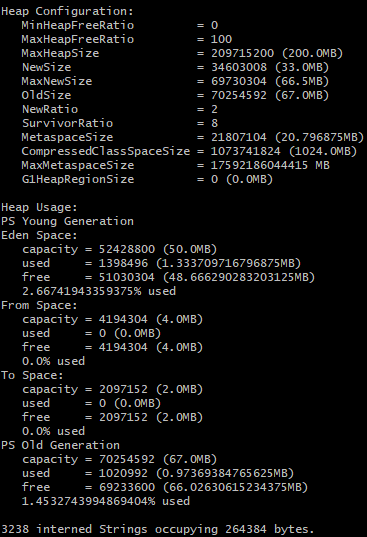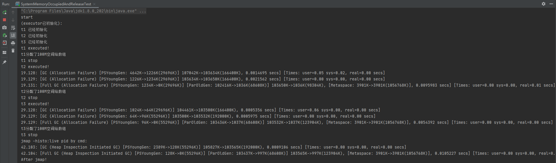 上述代码里我先定义了三个Thread对象,这三个对象都是在run()方法里分配了100M大小的char[],然后线程休眠(sleep)5秒。然后new一个线程池,并将这三个线程对象依次交给线程池去execute。线程池每两次execute之间相隔10秒,这是为了给足时间给上一个线程跑完并让jvm去回收这部分内存(200M的最大堆内存,一个线程对象要占用100多M,要跑下一个线程必然会发生GC),这样就能把GC信息打印下来便于观察。最后等到三个线程都执行完毕sleep一段时间(大概20秒),让我有时间手动在cmd执行jmap -histo live pid,该命令会强制触发FullGC,jmap命令之后你也可以试着执行jmap -heap pid,该命令不会触发gc,但是可以看下整个jvm堆的占用详情.
