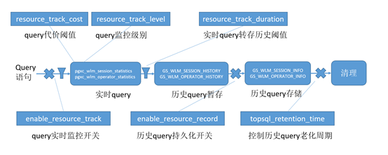 GaussDB(DWS)资源监控的作业级别监控,分为实时级别监控(实时TopSQL)与历史级别监控(历史TopSQL)。实时TopSQL可以完成对于运行中的SQL进行资源监控,其可以通过查询gs_wlm_sesssion_statistics查询得到。历史TopSQL可以对运行结束之后的SQL进行监控其可以通过查询gs_wlm_session_history得到相应的资源消耗信息。如图1所示,在设置enable_resource_track为on,resource_track_level为query的时候,当该SQL的执行代价大于设定的resource_track_cost的时候,就可以在实时TopSQL中查到相应的SQL执行信息,当该SQL执行结束之后对于其执行时间大于resource_track_duration的SQL即可以在历史TopSQL中查询到。在设置enable_resource_record为on的时候,每过三分钟会将gs_wlm_session_history中的数据落盘存到gs_wlm_session_info中。对于存入到gs_wlm_session_info中的数据可以通过设定topsql_rentention_time对其中的数据进行老化处理。