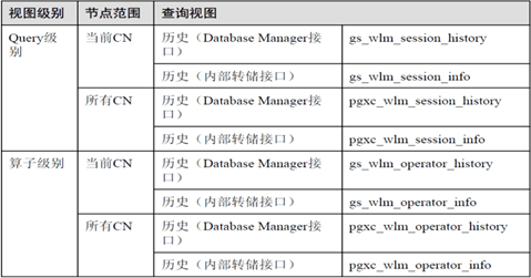 系统提供了query级别和算子级别的资源监控历史视图来查询历史TopSQL。资源监控历史视图记录了查询作业运行结束时的资源使用情况(包括内存、下盘、CPU时间、IO等)和运行状态信息(包括报错、终止、异常等)以及性能告警信息。但对于由于FATAL、PANIC错误导致查询异常结束时,状态信息列只显示aborted,无法记录详细的异常信息。这里需要开启参考手册开启相应的GUC参数。这里相关的视图与表如图4.1所示。