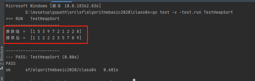 敲命令 go test -v -test.run TestHeapSort 执行结果如下: