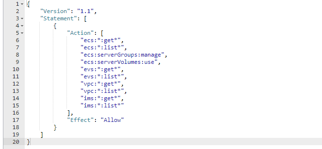 按照IAM官网的分配委托权限,IAM管理员创建一个专用的IAM策略,其中的 Resource --> url JSON数组中包含步骤二创建的所有委托ID
