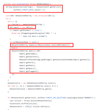定位代码发现metastore服务是在HiveMetastoreClient类中调用resolveUris方法去对metastore.thrift.uris转换成URL类。