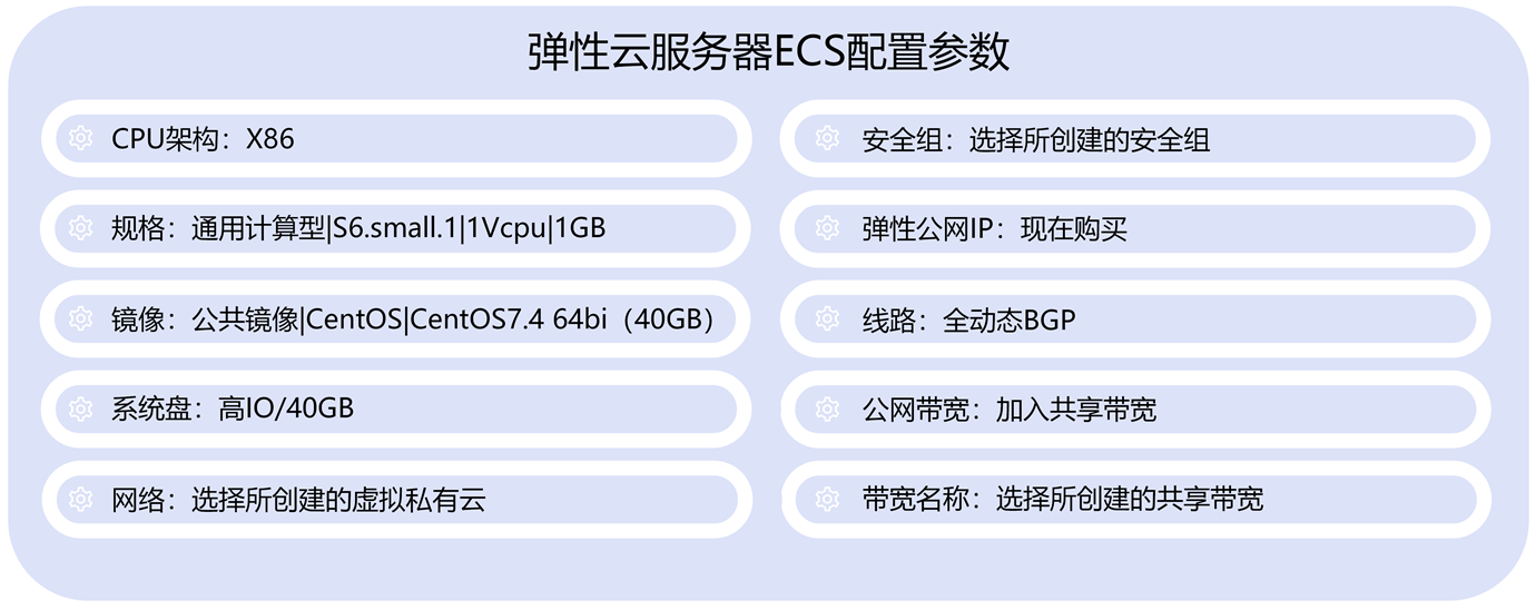 配置好了安全组和VPC后,我们便可以在其中创建一个弹性云服务器ECS,弹性云服务器时有CPU、内存、镜像和云硬盘组成的一种可随时获取,弹性可扩展,同时合了虚拟私有云、虚拟防火墙、数据多副本保存能力的计算服务器。我们使用X86架构的CPU进行搭建网站,进入华为云弹性云服务器购买配置页面后,可参考一下参数进行配置: