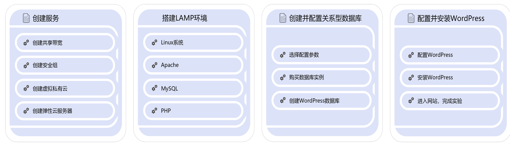 先来看看搭建网站的总体思路,完成一个网站应用的搭建需要操作以下5个步骤:创建共享带宽,让我们部署到云上的项目得以访问;然后创建所需要的安全组、虚拟私有云和弹性云服务器;搭建LAMP环境;创建网站所用的数据库;最后对网站进行设置。