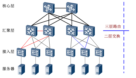 政府部门或者金融机构等大型企业的数据中心中服务器的规模可能会达到2000台以上。一般情况下,数据中心网络都会进行服务器的分区管理,单个业务分区规模不大,此时可以采用下图所示的标准三层架构。