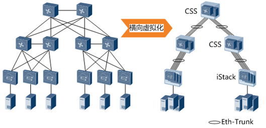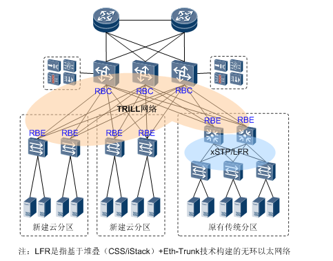 在这种组网方式中,核心层是整个数据中心网络的枢纽,核心设备通常部署2-4台大容量高端框式交换机,可以是独立部署,也可以通过CSS、iStack虚拟化技术后成组部署。分区内的汇聚层和接入层通过传统CSS、iStack、xSTP等技术实现二层破环,也可在汇聚层和接入层应用纵向虚拟化技术(如SVF)实现接入层的简单管理及节点扩展。