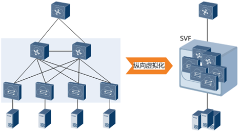 EOR套餐模式:SVF,将不同网络层次、不同类型的交换机多虚一,通过纵向整合,网络简化效果也非常明显,结构更加简明清晰。