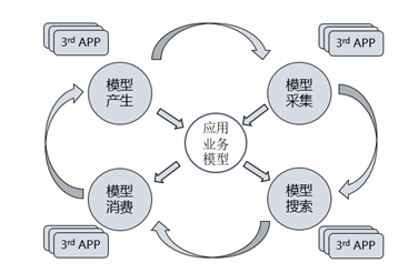 - 第三方应用或者系统可以通过统一的接口获取技术模型、业务模型,更进一步完成模型的消费,第三方应用或者系统基于已有的存量模型通过组合、编排等方式生成新的模型后,在回馈给应用业务模型管理服务,让所有模型像血液一样不停在整个系统中流动,最终形成完整的模型生态。