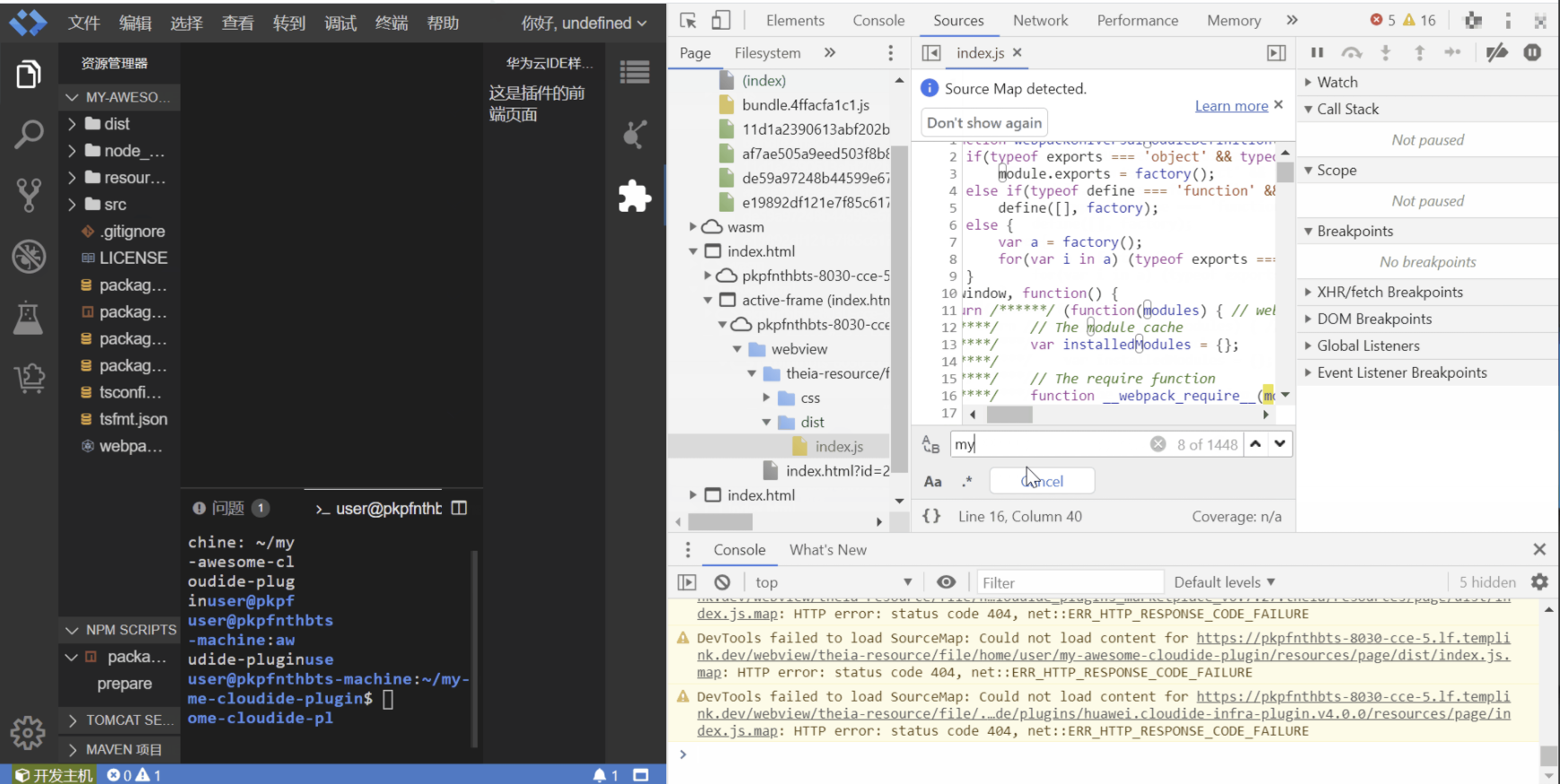 - 在页面列表中我们找到自己插件的首页,这里是index.html。接下来逐级向下展开到active-frame/{调试实例地址}/webview/dist/index.js。打开index.js文件。