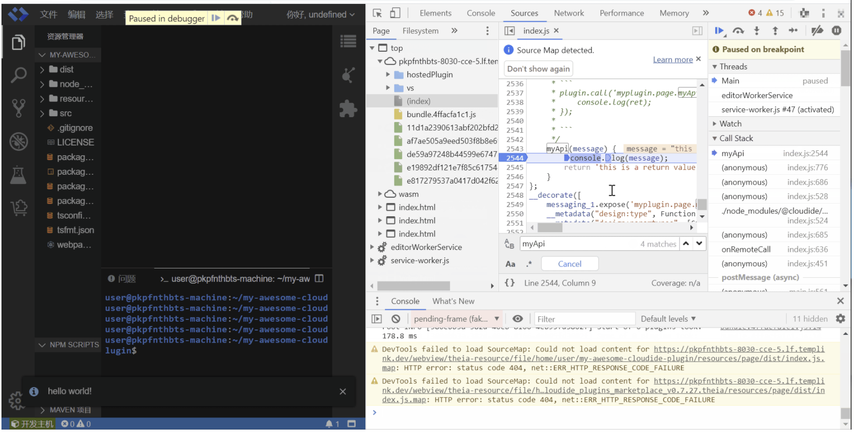 简单总结下,CloudIDE插件的调试其实分为前后端,后端的调试可以借助CloudIDE本身完成,而前端代码的调试则需要借助于浏览器的调试能力,在掌握调试技能之后在后续的插件开发过程中对疑难问题的定位和解决将非常有帮助。在后续的文章中将对插件的运行机制和API进行深入介绍,有兴趣的读者也可以先参考插件开发指南进行了解。