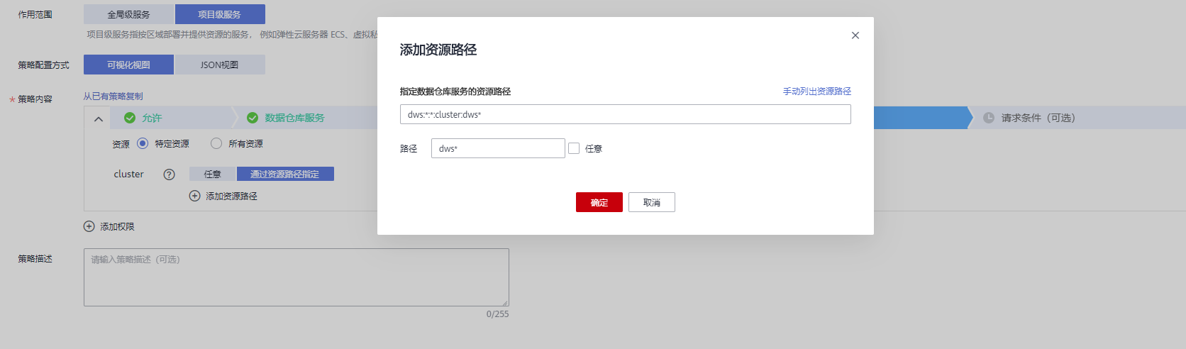 - 选择资源类型,如选择“特定类型”可以点击“通过资源路径指定”来指定需要授权的资源,路径填写dws*