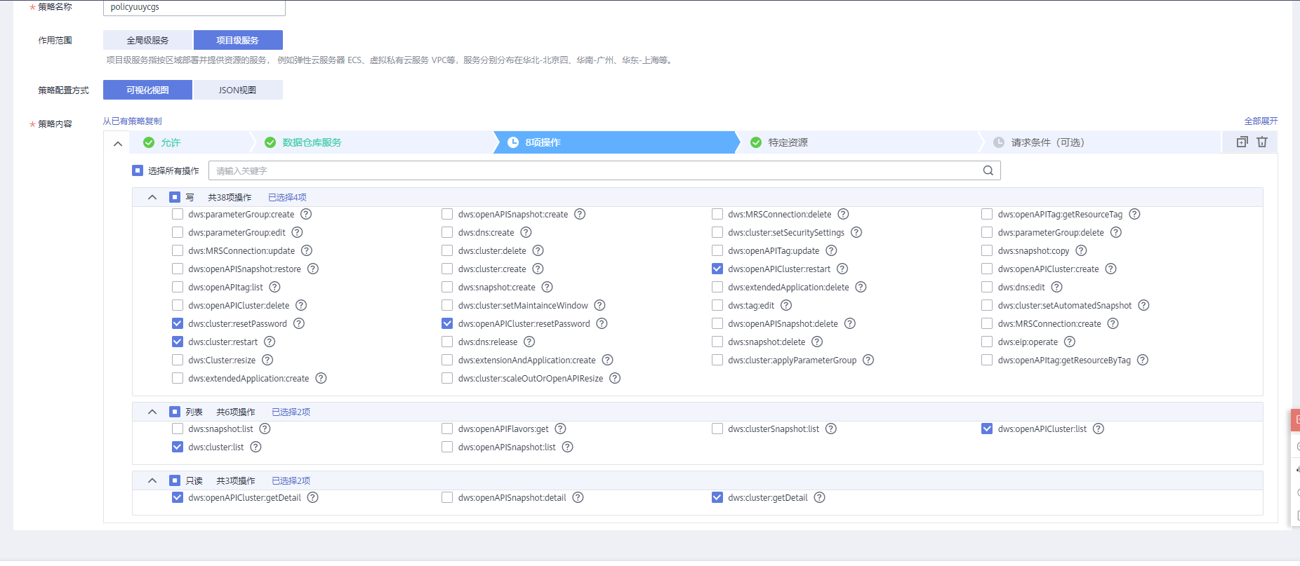 "dws:Cluster:resize" ----单个action,<云服务CSBI缩写>:<云资源类型>:<对云资源的操作>