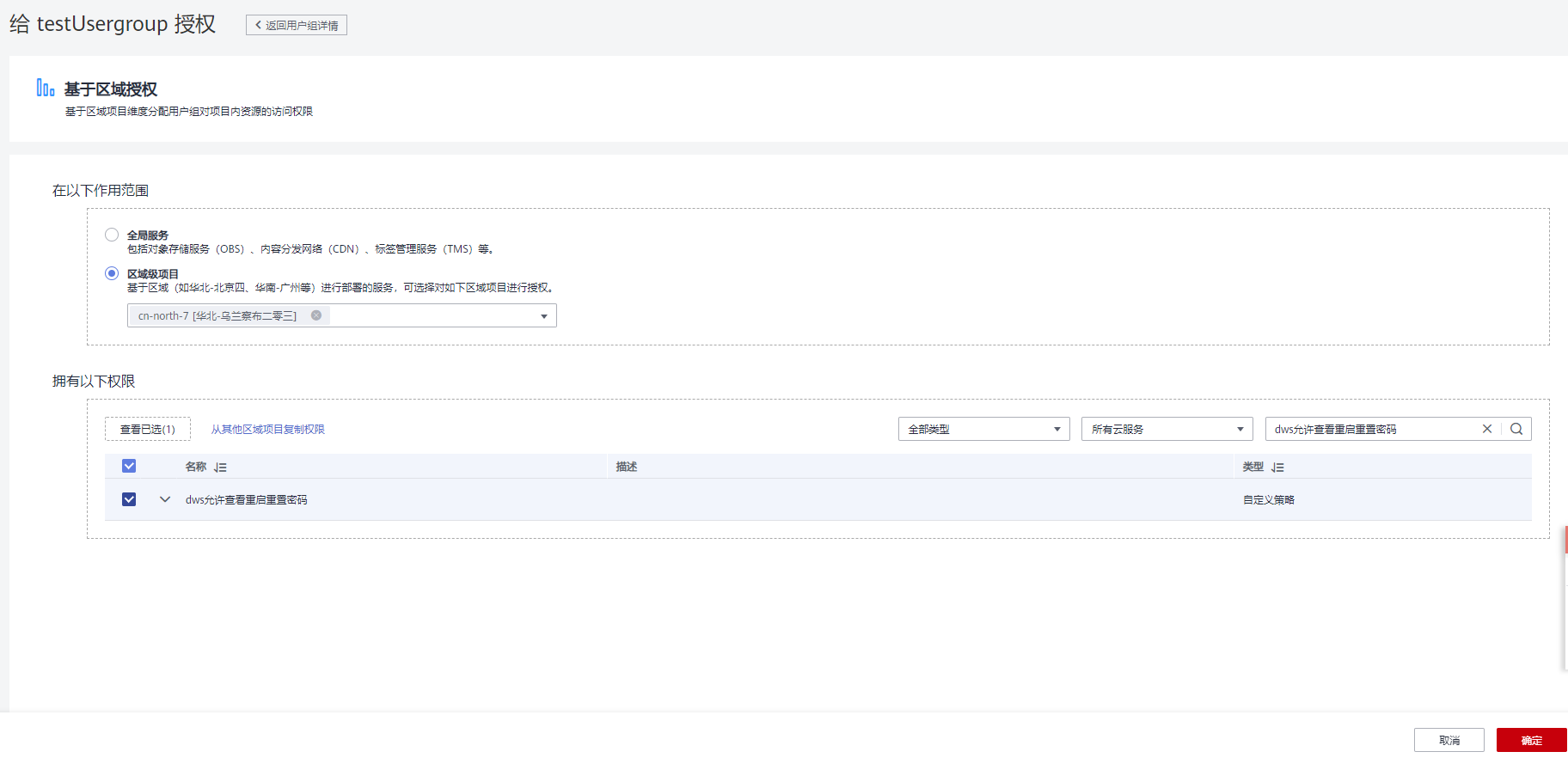 例:当前用户只有查看数据仓库服务中以“dws”字符开头命名的资源,并且有对该资源有重启和重置密码的权限。