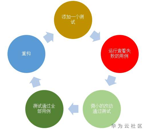 测试驱动开发是一个过程,依赖于不断重复极短的开发周期,这个周期也称为“红灯-绿灯-重构”,如上图。简单的来说,基于TDD的三项原则,TDD的这种步骤(周期)如下: