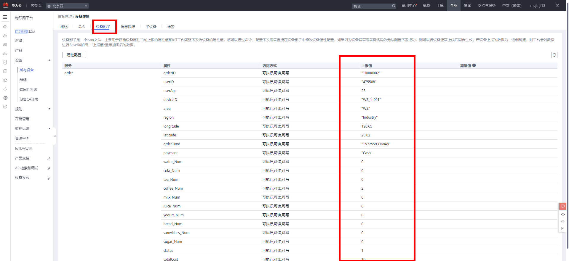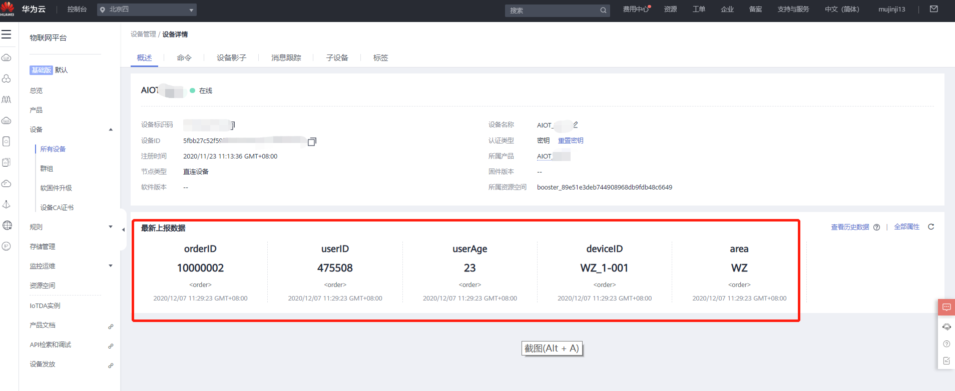 华为云⇒物联网⇒设备接入IoTDA⇒设备,可以看到有数据上来了,如下图显示: