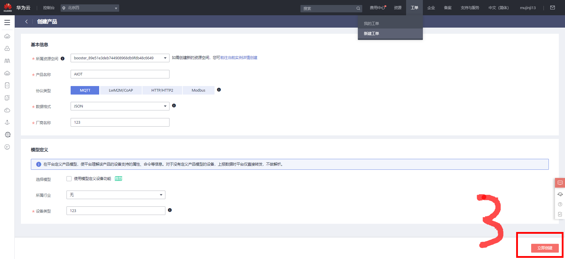 华为云⇒物联网⇒设备接入IoTDA产品⇒创建产品 ,如下图所示: