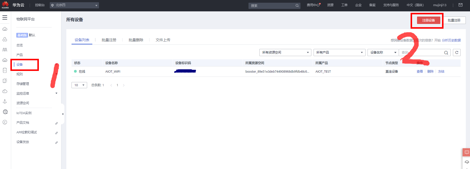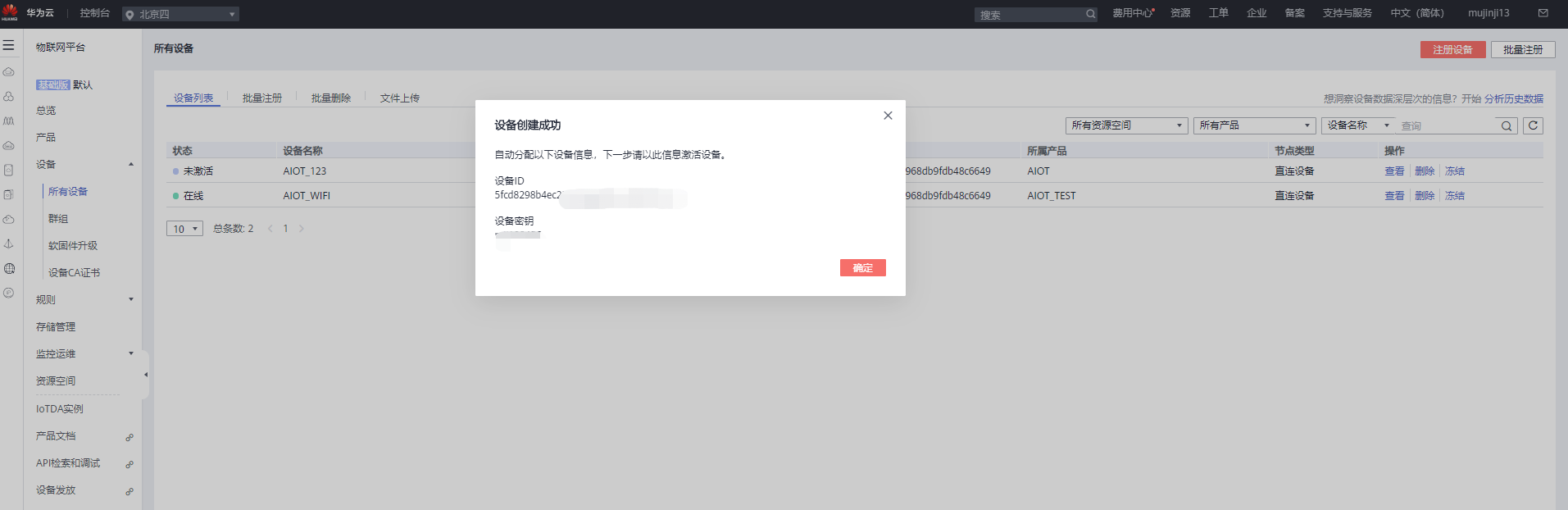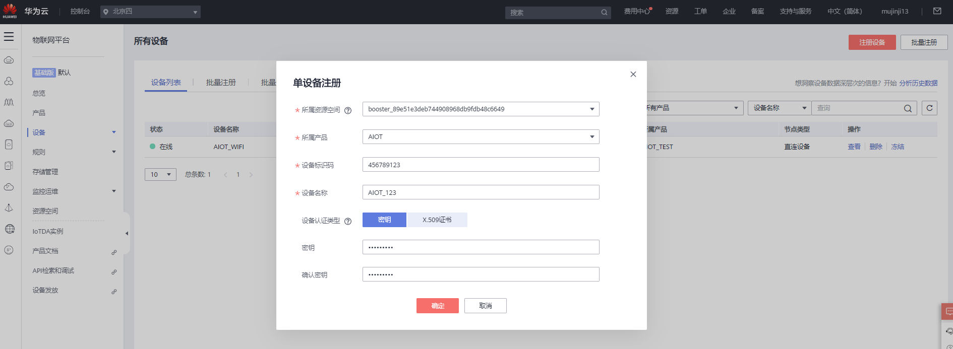 如下图所示:所属资源空间:与产品的选择保持一致。所属产品(刚才创建):AIOT。设备识别码(自定义):456789123。设备名称(自定义):AIOT_123。设备认证类型:密钥。密钥(自定义),不要忘了设置密码,后边要用。