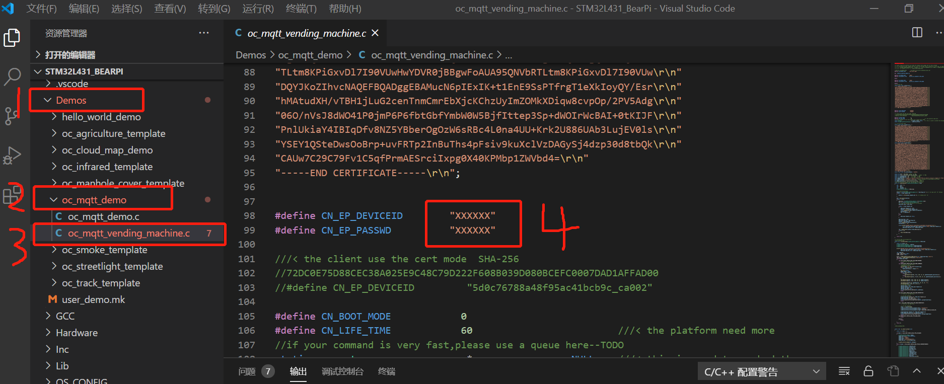 修改Demos\oc_mqtt_demo\oc_mqtt_vending_machine.c文件,把云平台的设备ID和密码(之前在记事本保存好的),分别替换第98和第99的xxxxxx。 如下图所示: