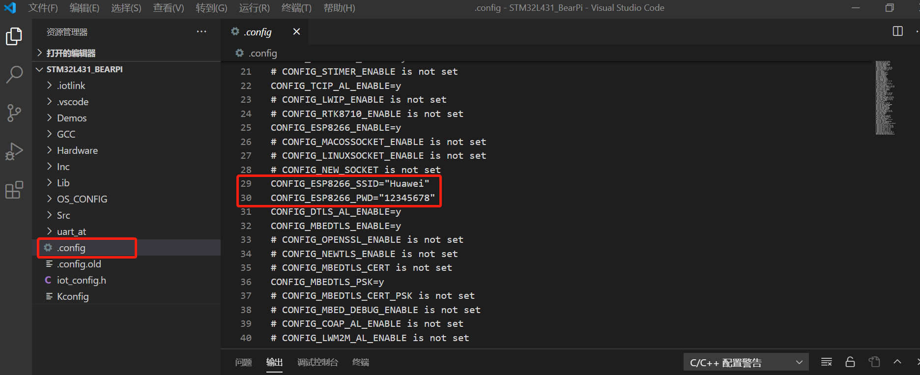 修改wifi账号和密码,找一个附近常用可以上网的WiFi账号和密码。需要修改2处,第一处是.config文件。第二处是iot_config.h文件。如下图所示: